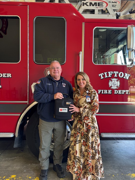 Pictured (L-R): Bobby “Roho” Bennett; Tifton Fire Chief and Mandy Brooks, Director of the Tift Regional Medical Center Foundation